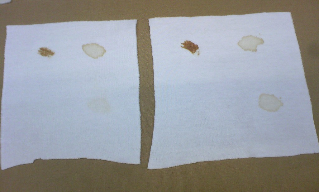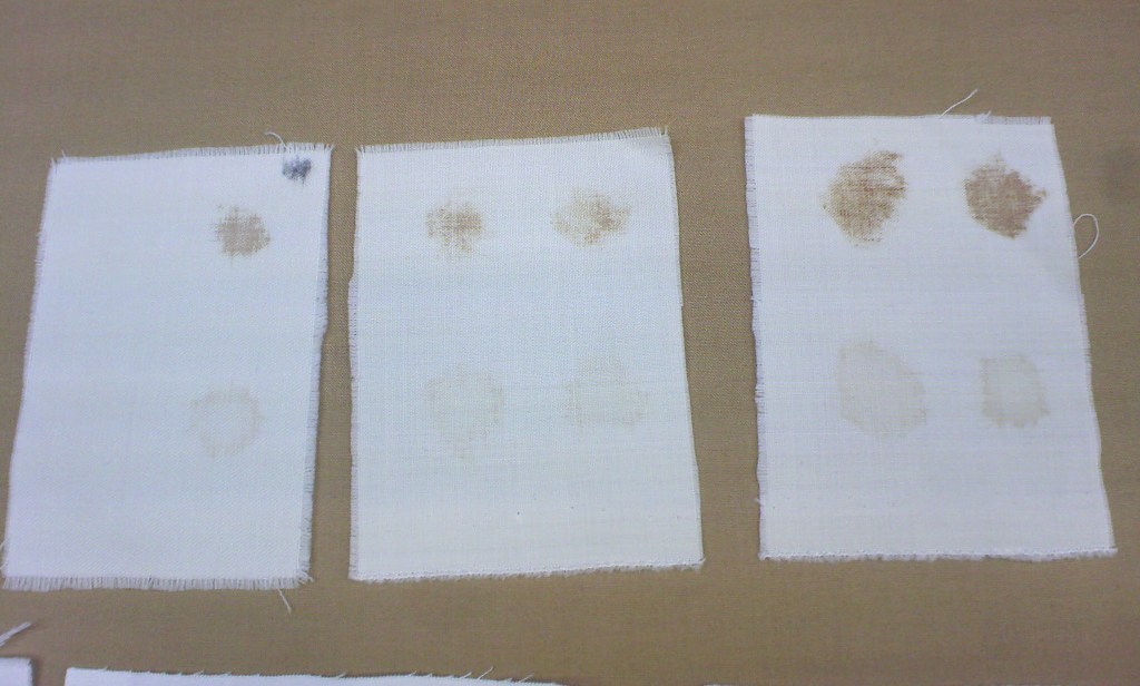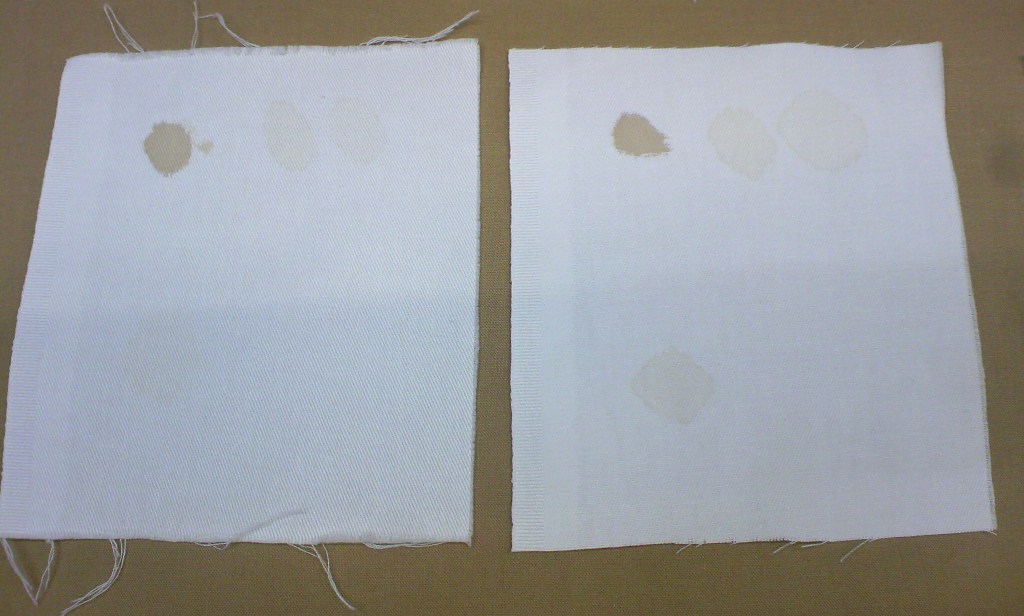 コットン2種類(織物と編物)とウールの生地(共に市販されているもの)に醤油のシミ(原液と5倍希釈)を付けて通常のドライクリーニング処理を行いました。