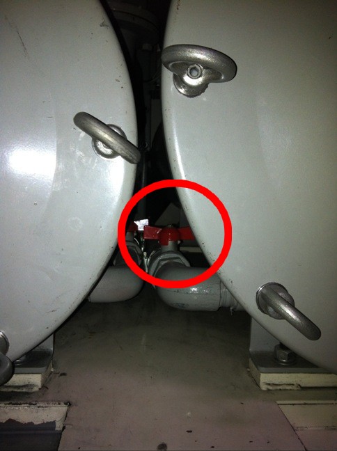 ドラム内に溶剤を溜めた後、フィルター(カーボン)タンク内の溶剤を抜く為にコック(赤丸部分)を開きます。
